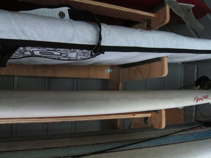 With a rack this tall, you'll probably want to secure it to the wall or ceiling at the top, especially in earthquake country. Bungees to hold the boards in place in the event of a tremor might be a good idea, too.